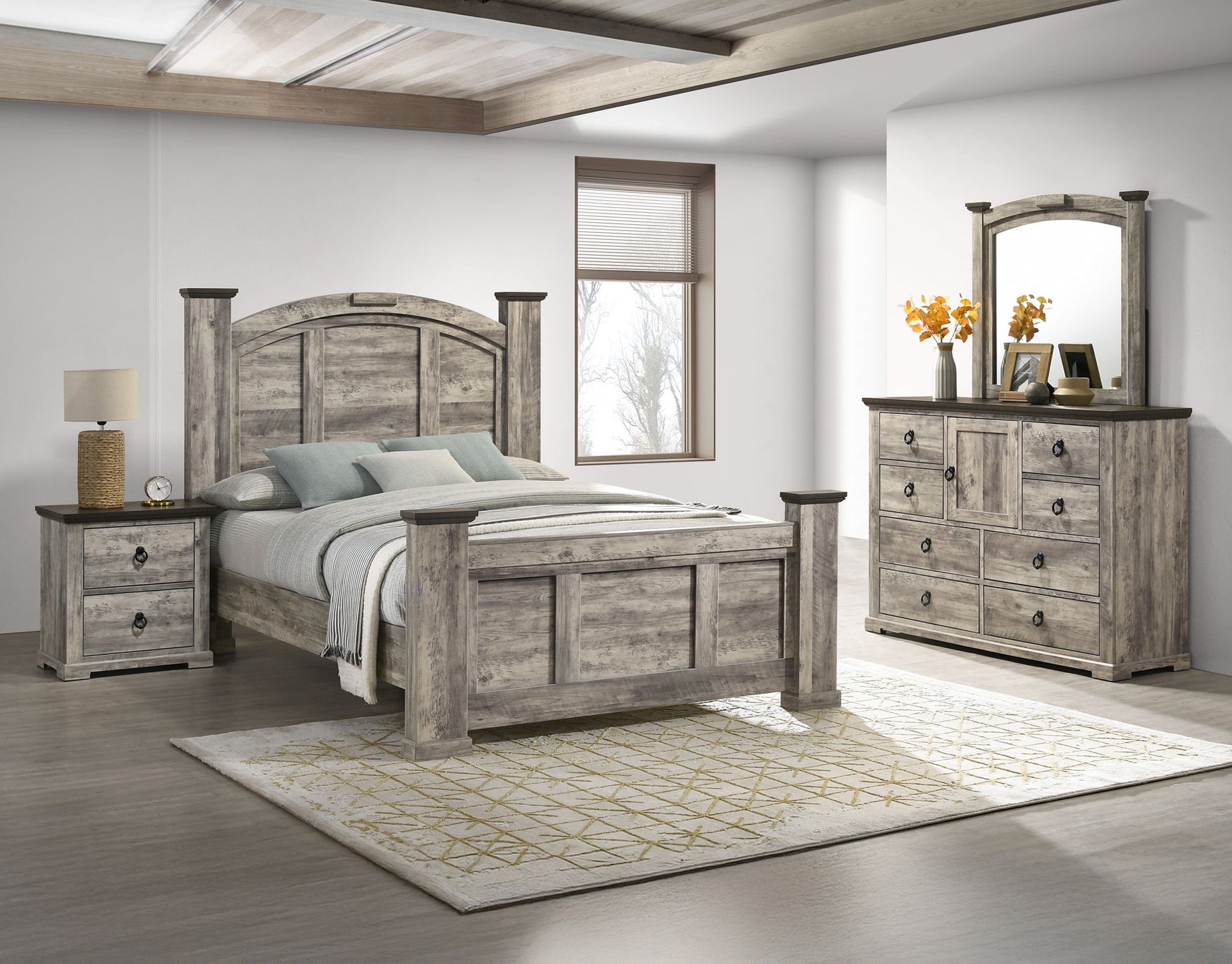 Immerse yourself in the rustic charm of this exquisite bedroom collection, where timeless design meets sophisticated craftsmanship. The set exudes a warm, weathered aesthetic that effortlessly complements any home decor, bringing an air of tranquil elegance to your personal sanctuary. Each piece is meticulously constructed with durability in mind, featuring robust frames, ample storage, and finely detailed hardware.