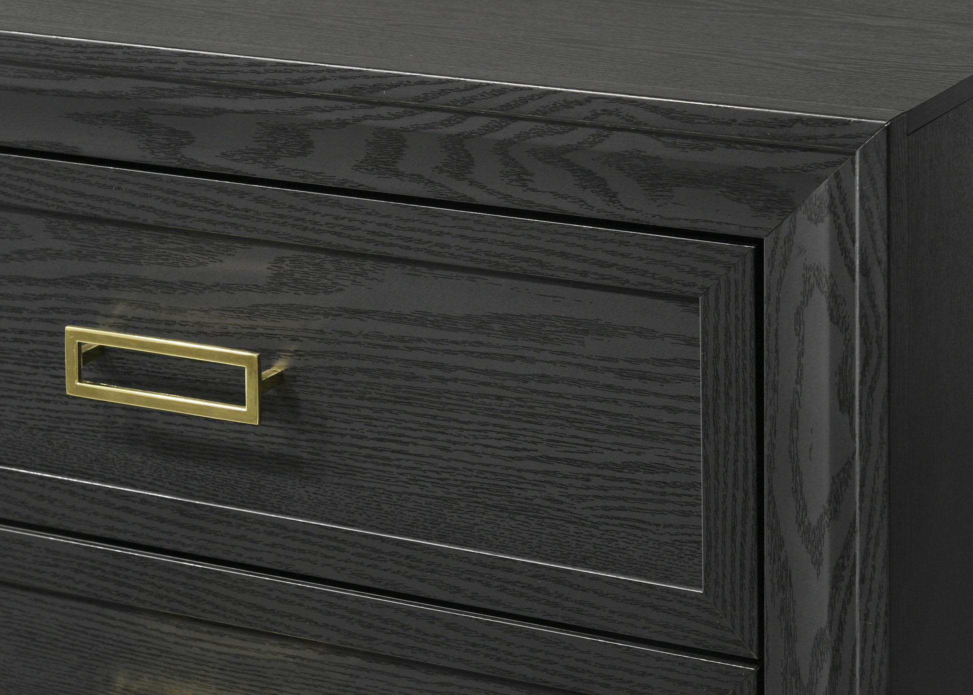 This bedroom collection offers a sophisticated palette of black and gold, presenting a refined look that's both modern and timeless. The bed anchors the set with its plush, button-tufted headboard framed by a bold, gold accent trim, creating a luxurious focal point. The matching dresser, chest, and nightstand feature sleek, black surfaces complemented by gold hardware, adding a touch of elegance. Each piece stands on neat gold-finished legs, lifting the furniture off the ground and enhancing the feeling of spaciousness. The dresser's large mirror reflects light and adds depth, making it as functional as it is stylish.